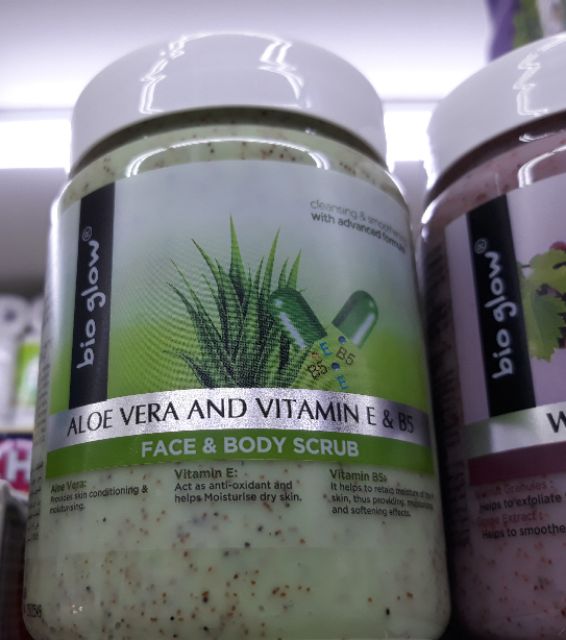 Reviews 1 Bio Glow Aloe Vera and Vitamin E B5 Face and body scrub helps exfoliate dead skin and provides smoothing and nourishing effects to the skin. Price and quantity-rs 99 for 75 ml.